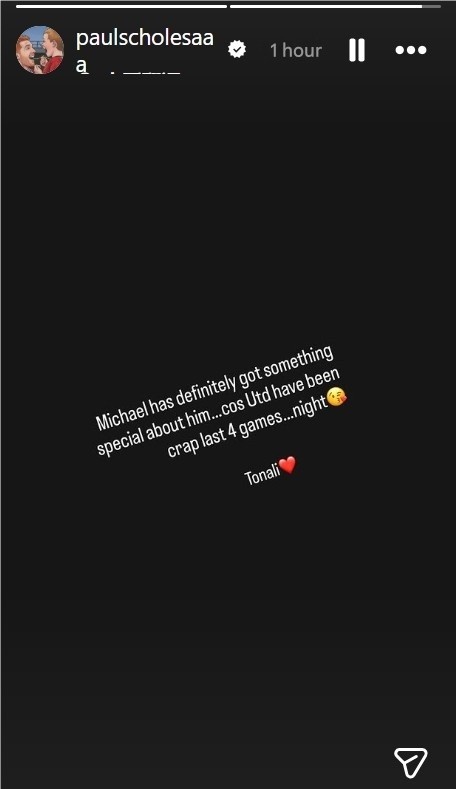 曼联名宿斯科尔斯赛后社媒发文嘲讽主帅卡里克:“迈克尔(卡里克)身上肯定有某种特别之处……因为曼联最近4场比赛表现简直烂透了……晚安😘托纳利❤️”